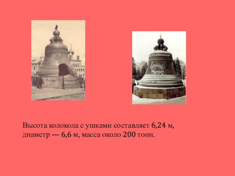 Слайд 28Высота колокола с ушками составляет 6,24 м, диаметр — 6,6 м, масса около 200