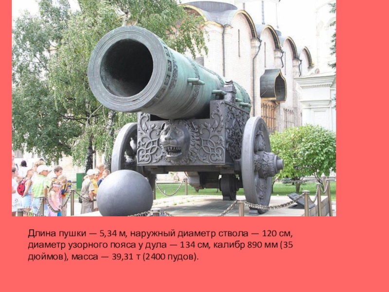 Слайд 27Длина пушки — 5,34 м, наружный диаметр ствола — 120 см, диаметр узорного пояса