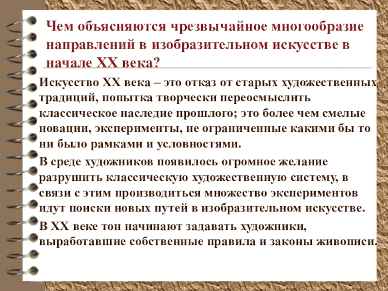 В среде художников появилось огромное желание разрушить классическую художественную систему, в связи с этим производиться множество экспериментов идут поиски новых путей в изобразительном искусстве.
