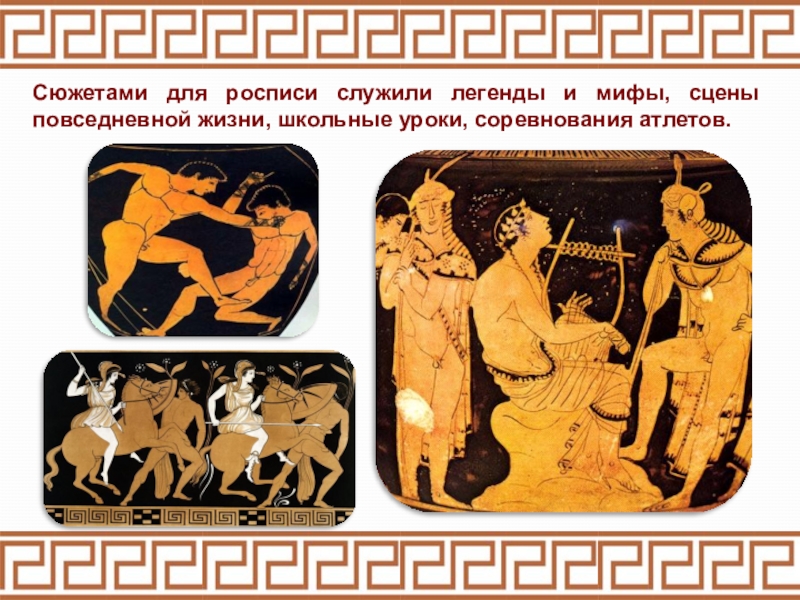Слайд 50Сюжетами для росписи служили легенды и мифы, сцены повседневной жизни, школьные