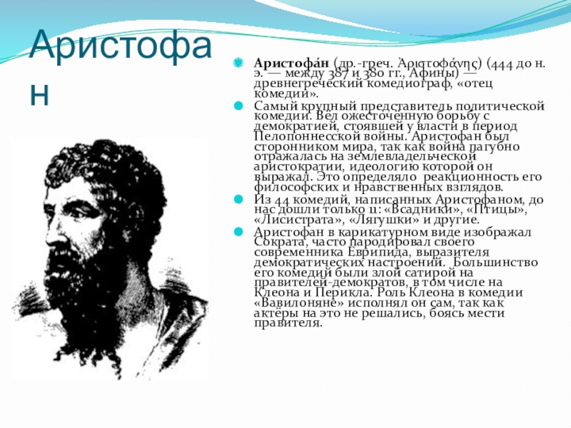 Слайд 58Аристофа́н (др.-греч. Ἀριστοφάνης) (444 до н. э. — между 387 и 380
