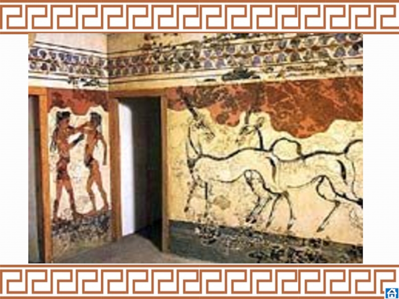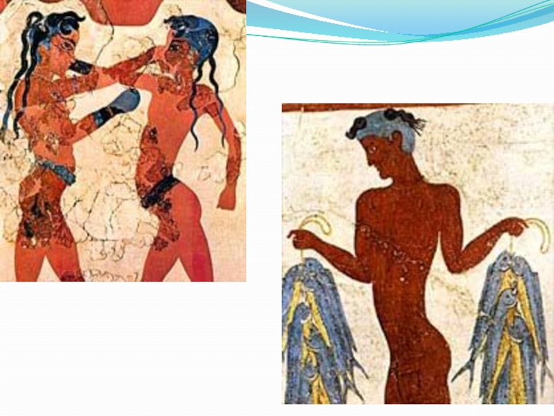 "Игры с быком" — на синем фоне огромная фигура быка и рядом с ним три маленьких человеческих фигурки — одна — перед страшными рогами, другая — на его спине в головокружительном кувырке. По-видимому эта фреска изображает реальные игры — то ли развлечение, то ли религиозный обряд.