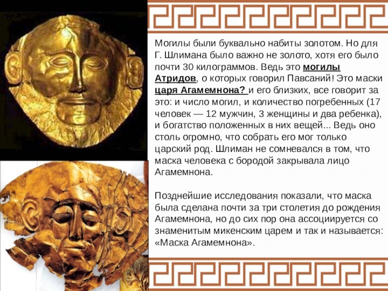 Позднейшие исследования показали, что маска была сделана почти за три столетия до рождения Агамемнона, но до сих пор она ассоциируется со знаменитым микенским царем и так и называется: «Маска Агамемнона».