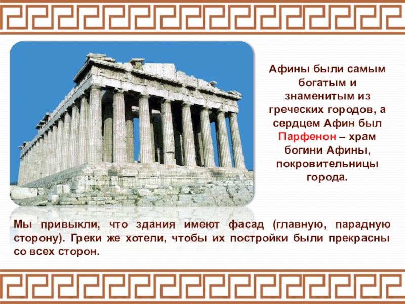 Слайд 19Мы привыкли, что здания имеют фасад (главную, парадную сторону). Греки же