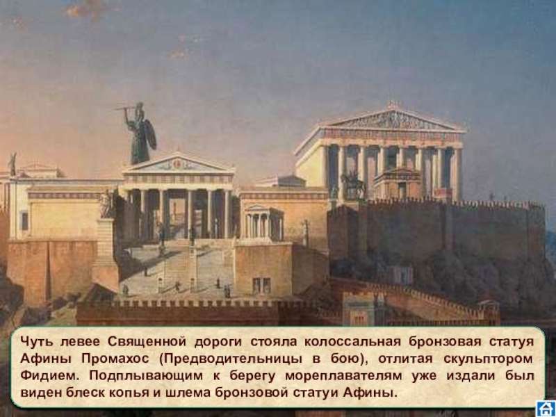 Слайд 16Чуть левее Священной дороги стояла колоссальная бронзовая статуя Афины Промахос (Предводительницы