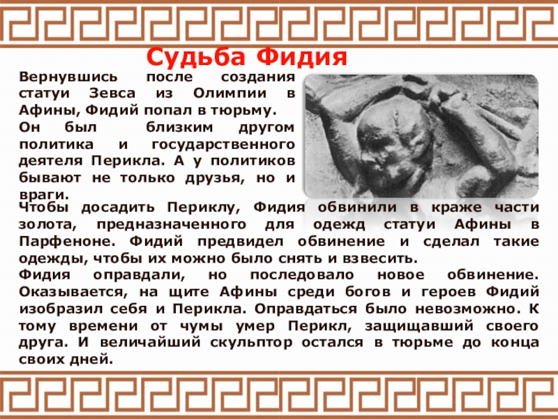 Фидия оправдали, но последовало новое обвинение. Оказывается, на щите Афины среди богов и героев Фидий изобразил себя и Перикла. Оправдаться было невозможно. К тому времени от чумы умер Перикл, защищавший своего друга. И величайший скульптор остался в тюрьме до конца своих дней.