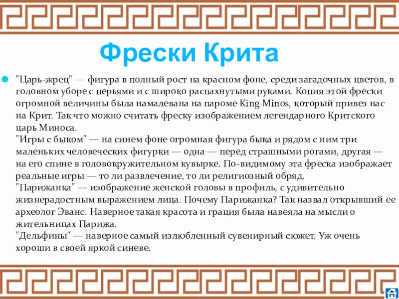 загадочных цветов, в головном уборе с перьями и с широко распахнутыми руками. Копия этой фрески огромной величины была намалевана на пароме King Minos, который привез нас на Крит. Так что можно считать фреску изображением легендарного Критского царь Миноса.