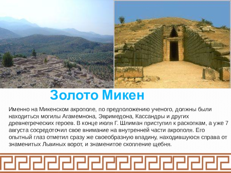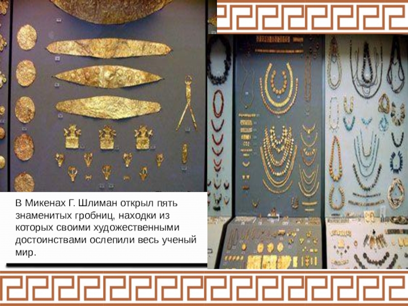 Слайд 29В Микенах Г. Шлиман открыл пять знаменитых гробниц, находки из которых