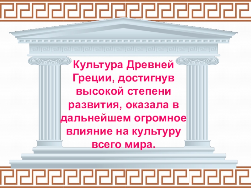 Слайд 61Культура Древней Греции, достигнув высокой степени развития, оказала в дальнейшем огромное