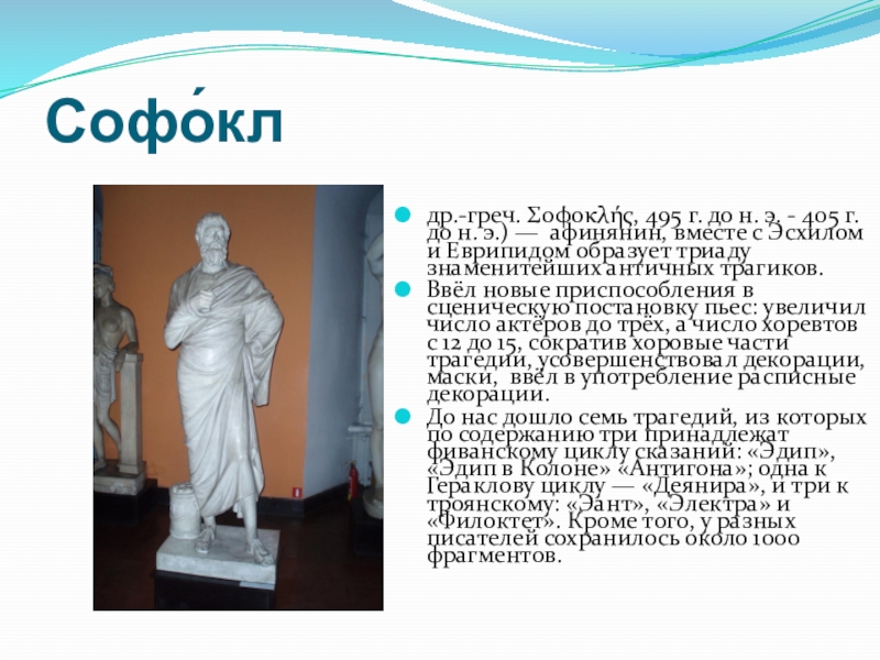 н. э.) — афинянин, вместе с Эсхилом и Еврипидом образует триаду знаменитейших античных трагиков.