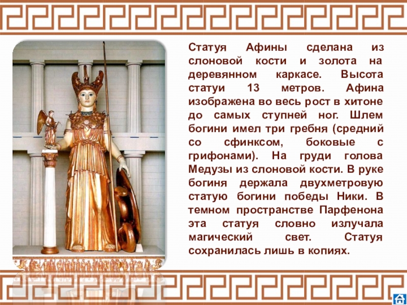 каркасе. Высота статуи 13 метров. Афина изображена во весь рост в хитоне до самых ступней ног. Шлем богини имел три гребня (средний со сфинксом, боковые с грифонами). На груди голова Медузы из слоновой кости. В руке богиня держала двухметровую статую богини победы Ники. В темном пространстве Парфенона эта статуя словно излучала магический свет. Статуя сохранилась лишь в копиях.
