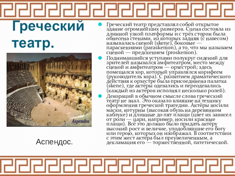 Греческий театр представлял собой открытое здание огромнейших размеров. Сцена состояла