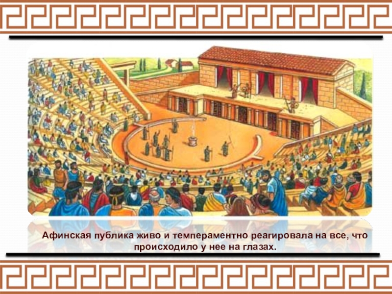 Слайд 56Афинская публика живо и темпераментно реагировала на все, что происходило у