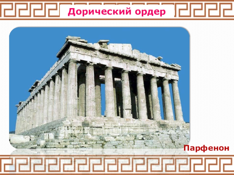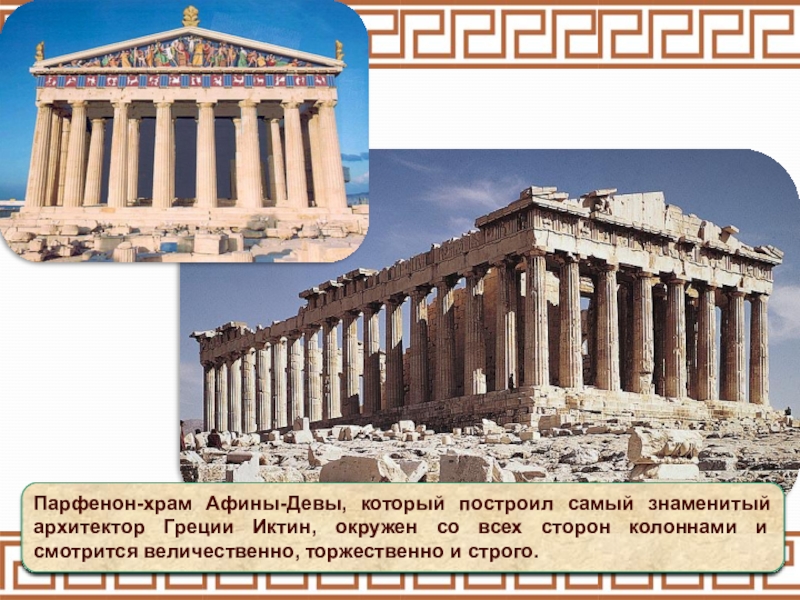 Слайд 20Парфенон-храм Афины-Девы, который построил самый знаменитый архитектор Греции Иктин, окружен со
