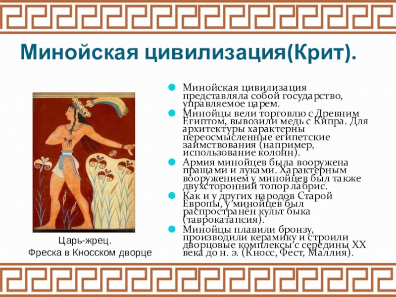 Минойцы плавили бронзу, производили керамику и строили дворцовые комплексы с середины XX века до н. э. (Кносс, Фест, Маллия).
