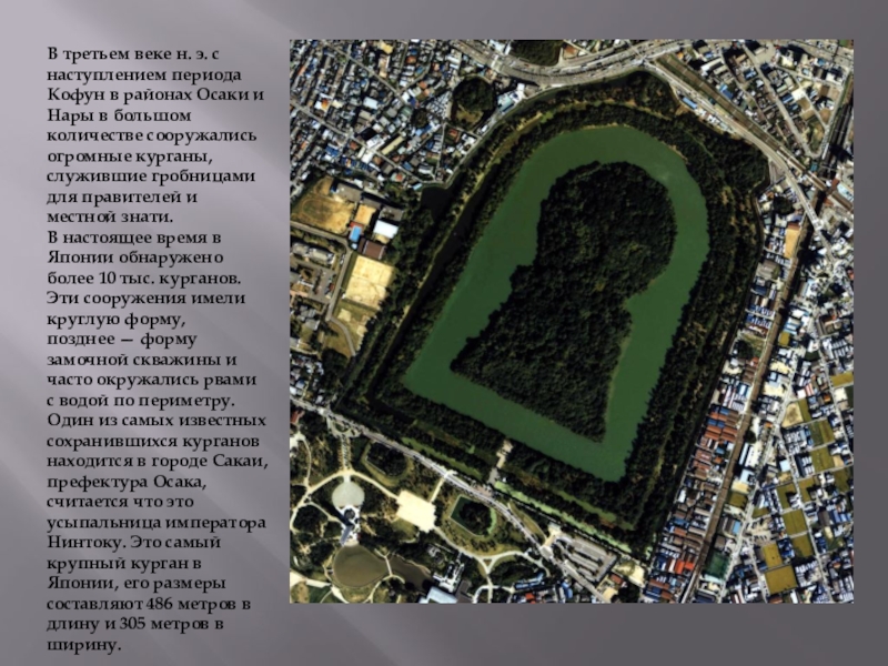 и Нары в большом количестве сооружались огромные курганы, служившие гробницами для правителей и местной знати. В настоящее время в Японии обнаружено более 10 тыс. курганов. Эти сооружения имели круглую форму, позднее — форму замочной скважины и часто окружались рвами с водой по периметру. Один из самых известных сохранившихся курганов находится в городе Сакаи, префектура Осака, считается что это усыпальница императора Нинтоку. Это самый крупный курган в Японии, его размеры составляют 486 метров в длину и 305 метров в ширину.