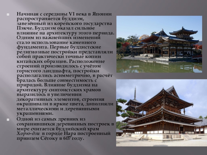 корейского государства Пэкче. Буддизм оказал сильное влияние на архитектуру этого периода. Одним из важнейших изменений стало использование каменного фундамента. Первые буддистские религиозные постройки представляли собой практически точные копии китайских образцов. Расположение строений производилось с учётом гористого ландшафта, постройки располагались асимметрично, в расчёт бралась больше совместимость с природой. Влияние буддизма на архитектуру синтоистских храмов выразилось в увеличении декоративных элементов, строения окрашивали в яркие цвета, дополняли металлическими и деревянными украшениями.