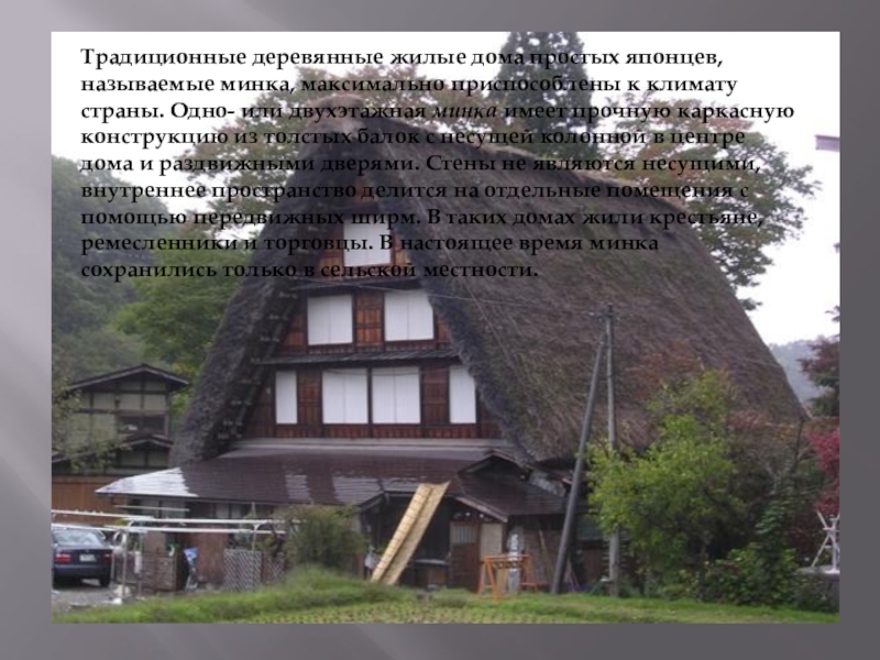 Слайд 3Традиционные деревянные жилые дома простых японцев, называемые минка, максимально приспособлены к