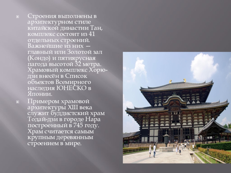 Слайд 8Строения выполнены в архитектурном стиле китайской династии Тан, комплекс состоит из