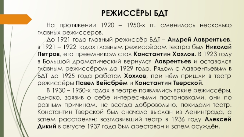 До 1921 года главный режиссёр БДТ – Андрей Лаврентьев. в 1921 – 1922 годах главным режиссёром театра был Николай Петров, его преемником стал Константин Хохлов. В 1923 году в Большой драматический вернулся Лаврентьев и оставался главным режиссёром до 1929 года. Рядом с Лаврентьевым в БДТ до 1925 года работал Хохлов, при нём пришли в театр режиссёры Павел Вейсбрём и Константин Тверской.