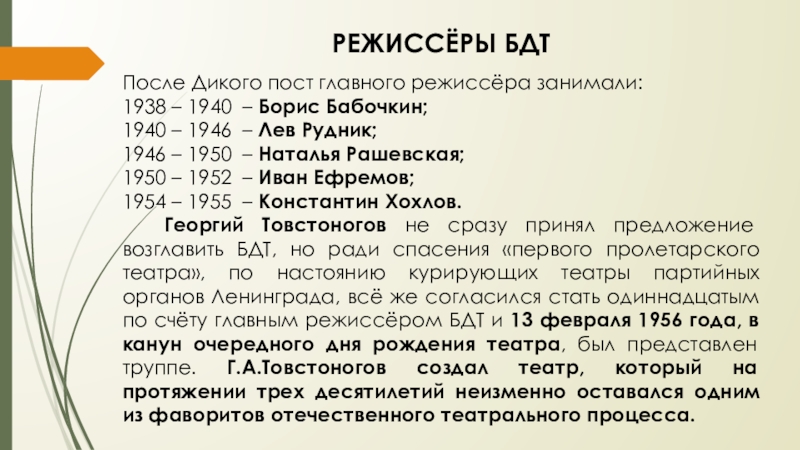 Георгий Товстоногов не сразу принял предложение возглавить БДТ, но ради спасения «первого пролетарского театра», по настоянию курирующих театры партийных органов Ленинграда, всё же согласился стать одиннадцатым по счёту главным режиссёром БДТ и 13 февраля 1956 года, в канун очередного дня рождения театра, был представлен труппе. Г.А.Товстоногов создал театр, который на протяжении трех десятилетий неизменно оставался одним из фаворитов отечественного театрального процесса.