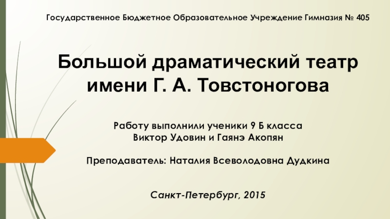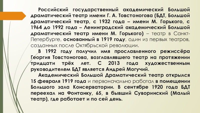 Слайд 2Российский государственный академический Большой драматический театр имени Г. А. Товстоногова (БДТ,