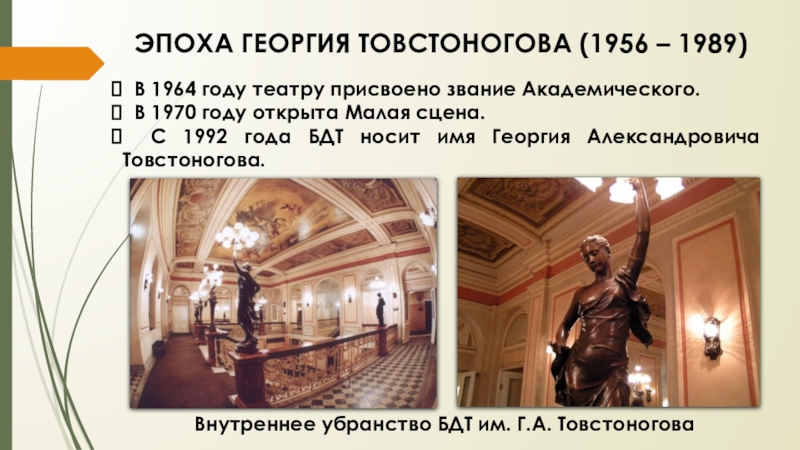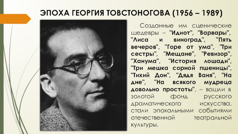 Слайд 10ЭПОХА ГЕОРГИЯ ТОВСТОНОГОВА (1956 – 1989)