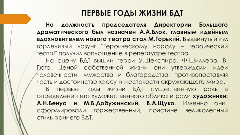 В первые годы жизни БДТ существенную роль в определении его художественного облика играли художники: А.Н.Бенуа и М.В.Добужинский, В.А.Щуко. Именно они сформировали торжественный, поистине великолепный стиль раннего БДТ.