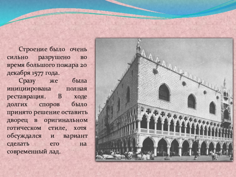 Слайд 5Строение было очень сильно разрушено во время большого пожара 20 декабря