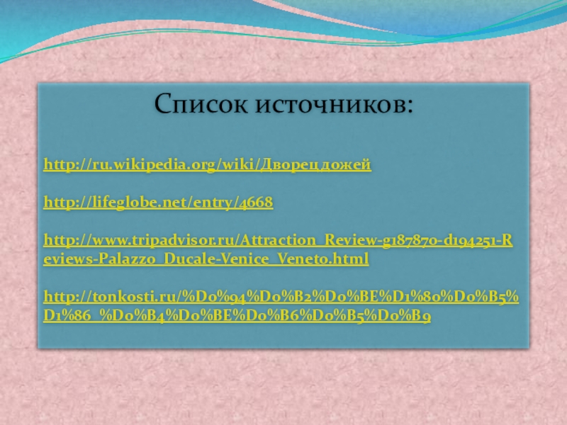 Список источников:http://ru.wikipedia.org/wiki/Дворец дожейhttp://lifeglobe.net/entry/4668 http://www.tripadvisor.ru/Attraction_Review-g187870-d194251-Reviews-Palazzo_Ducale-Venice_Veneto.html http://tonkosti.ru/%D0%94%D0%B2%D0%BE%D1%80%D0%B5%D1%86_%D0%B4%D0%BE%D0%B6%D0%B5%D0%B9
