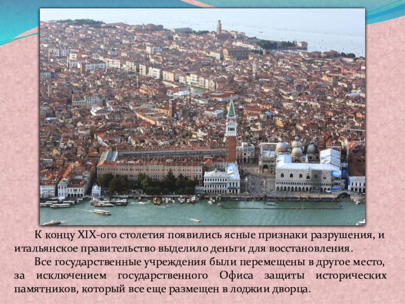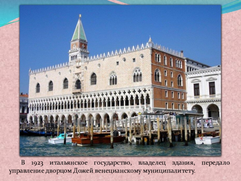 Слайд 7В 1923 итальянское государство, владелец здания, передало управление дворцом Дожей венецианскому