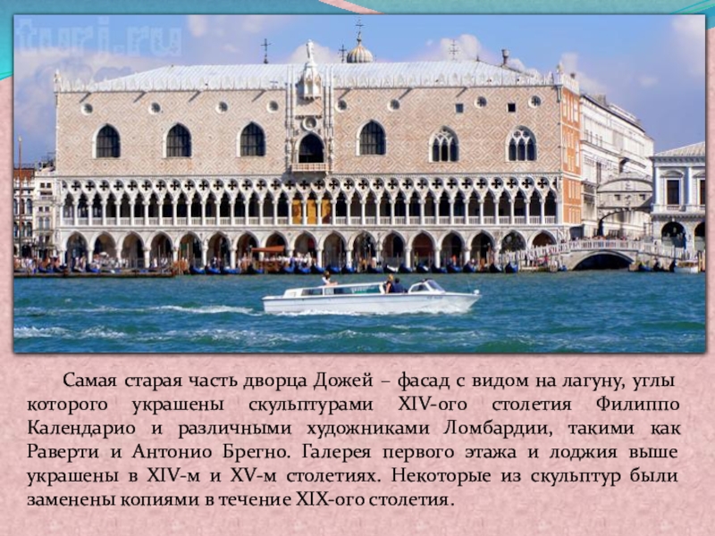 Слайд 8Самая старая часть дворца Дожей – фасад с видом на лагуну,