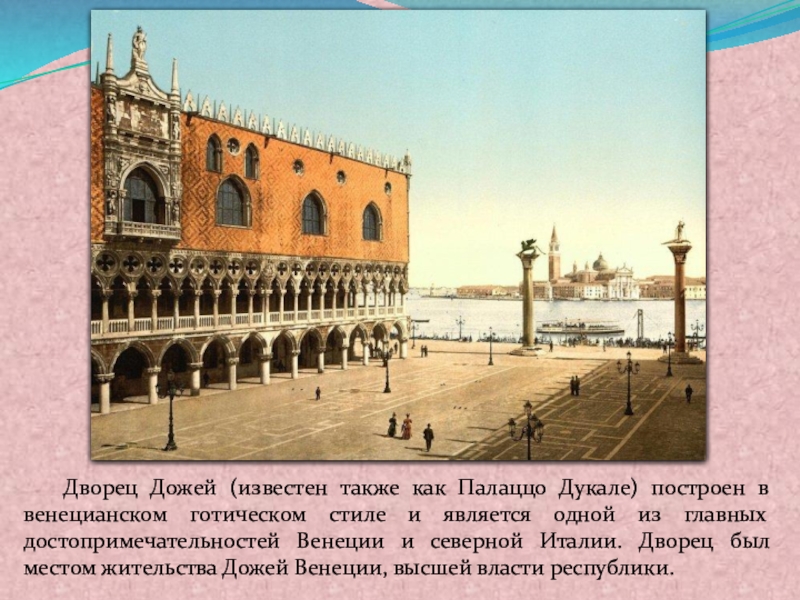 Слайд 3Дворец Дожей (известен также как Палаццо Дукале) построен в венецианском готическом