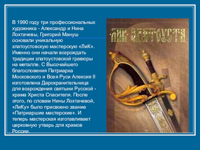 Григорий Мануш основали уникальную златоустовскую мастерскую «ЛиК». Именно они начали возрождать традиции златоустовской гравюры на металле. С Высочайшего благословения Патриарха Московского и Всея Руси Алексия II изготовлена Дарохранительница для возрождения святыни Русской - храма Христа Спасителя. После этого, по словам Нины Лохтачевой, «ЛиКу» было присвоено звание «Патриаршие мастерские». И теперь мастерская изготавливает церковную утварь для храмов России.