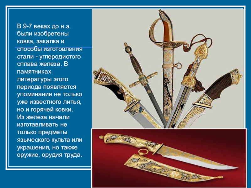 Слайд 54В 9-7 веках до н.э. были изобретены ковка, закалка и способы