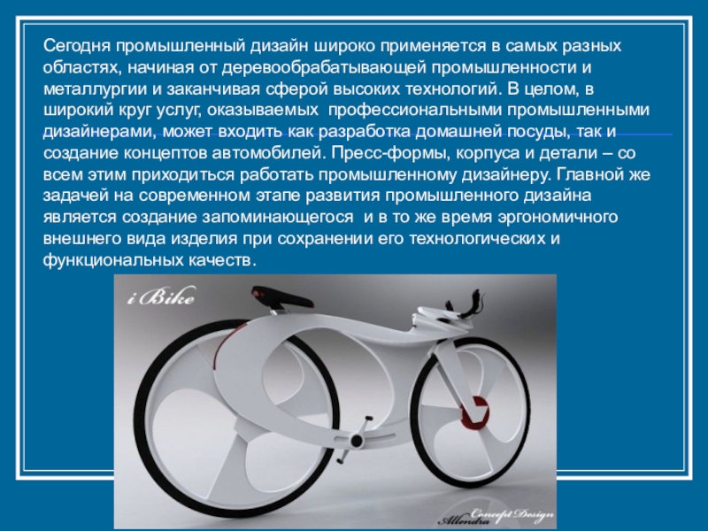 деревообрабатывающей промышленности и металлургии и заканчивая сферой высоких технологий. В целом, в широкий круг услуг, оказываемых профессиональными промышленными дизайнерами, может входить как разработка домашней посуды, так и создание концептов автомобилей. Пресс-формы, корпуса и детали – со всем этим приходиться работать промышленному дизайнеру. Главной же задачей на современном этапе развития промышленного дизайна является создание запоминающегося и в то же время эргономичного внешнего вида изделия при сохранении его технологических и функциональных качеств.