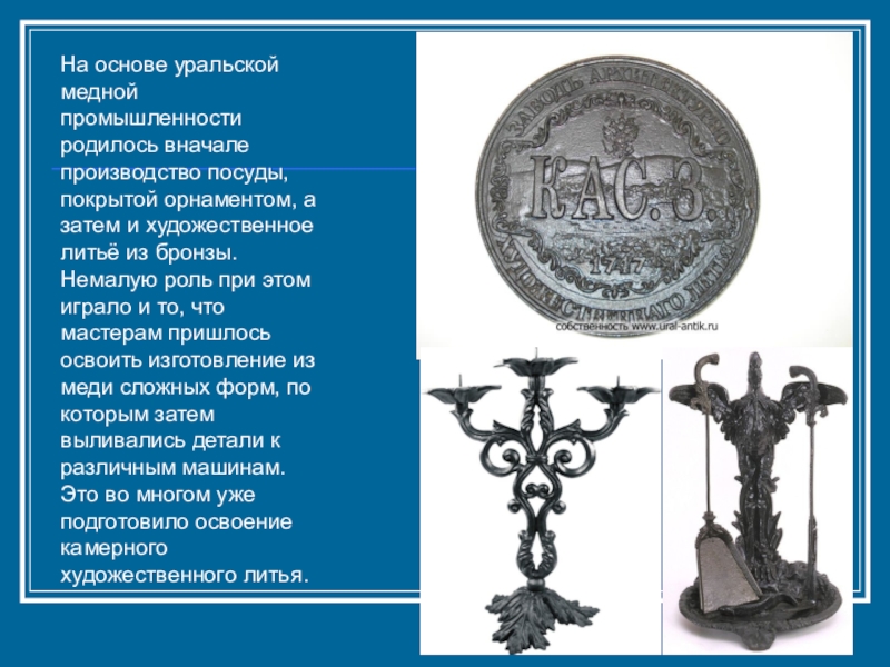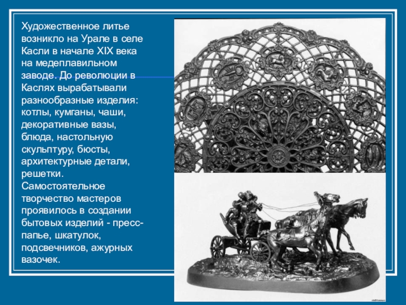 Слайд 59Художественное литье возникло на Урале в селе Касли в начале XIX