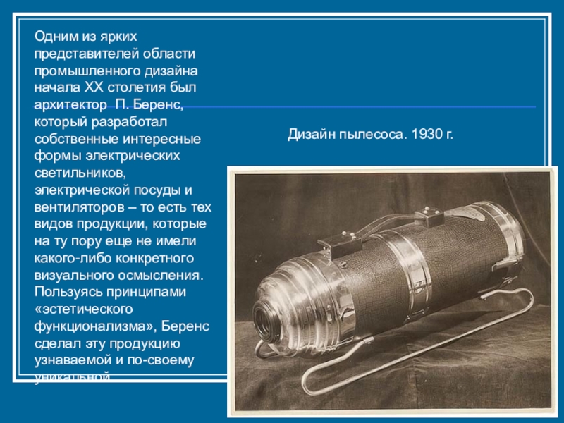 архитектор П. Беренс, который разработал собственные интересные формы электрических светильников, электрической посуды и вентиляторов – то есть тех видов продукции, которые на ту пору еще не имели какого-либо конкретного визуального осмысления. Пользуясь принципами «эстетического функционализма», Беренс сделал эту продукцию узнаваемой и по-своему уникальной.