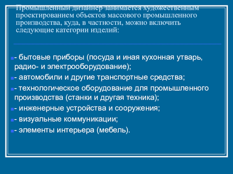Слайд 46Промышленный дизайнер занимается художественным проектированием объектов массового промышленного производства, куда, в