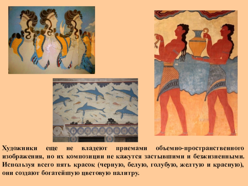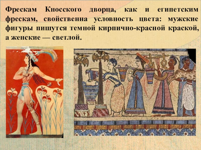 Слайд 20Фрескам Кносского дворца, как и египетским фрескам, свойственна условность цвета: мужские
