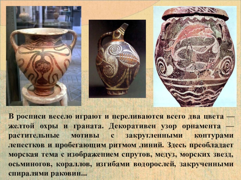 охры и граната. Декоративен узор орнамента — растительные мотивы с закругленными контурами лепестков и пробегающим ритмом линий. Здесь преобладает морская тема с изображением спрутов, медуз, морских звезд, осьминогов, кораллов, изгибами водорослей, закрученными спиралями раковин...