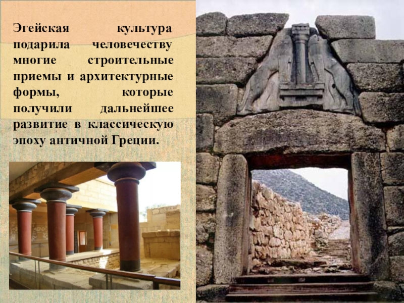Слайд 17Эгейская культура подарила человечеству многие строительные приемы и архитектурные формы, которые