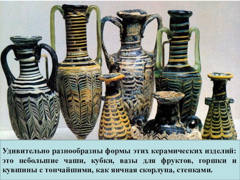 Слайд 25Удивительно разнообразны формы этих керамических изделий: это небольшие чаши, кубки, вазы