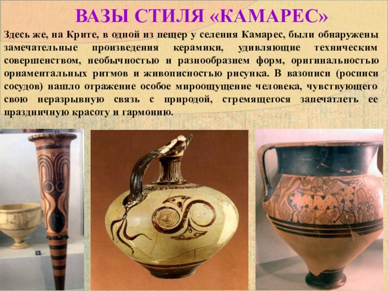 были обнаружены замечательные произведения керамики, удивляющие техническим совершенством, необычностью и разнообразием форм, оригинальностью орнаментальных ритмов и живописностью рисунка. В вазописи (росписи сосудов) нашло отражение особое мироощущение человека, чувствующего свою неразрывную связь с природой, стремящегося запечатлеть ее праздничную красоту и гармонию.