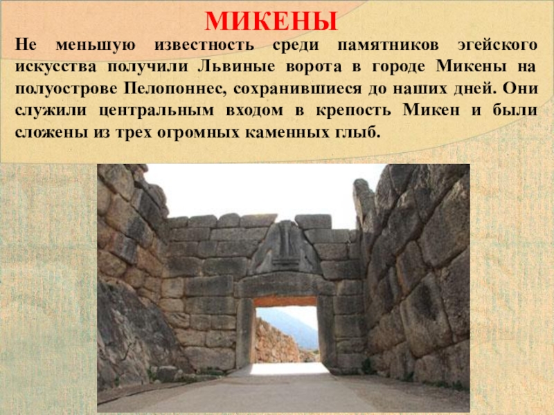 Слайд 14Не меньшую известность среди памятников эгейского искусства получили Львиные ворота в