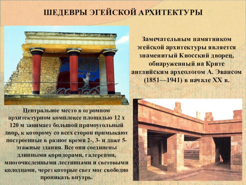 Замечательным памятником эгейской архитектуры является знаменитый Кносский дворец, обнаруженный