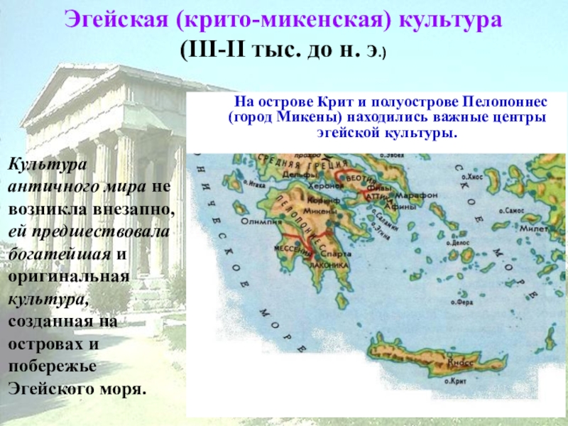 На острове Крит и полуострове Пелопоннес (город Микены) находились важные центры эгейской культуры.