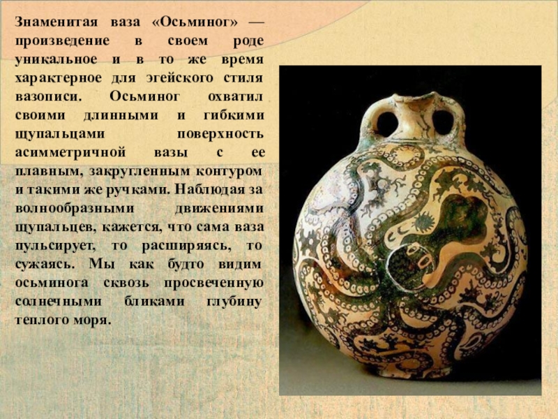 то же время характерное для эгейского стиля вазописи. Осьминог охватил своими длинными и гибкими щупальцами поверхность асимметричной вазы с ее плавным, закругленным контуром и такими же ручками. Наблюдая за волнообразными движениями щупальцев, кажется, что сама ваза пульсирует, то расширяясь, то сужаясь. Мы как будто видим осьминога сквозь просвеченную солнечными бликами глубину теплого моря.