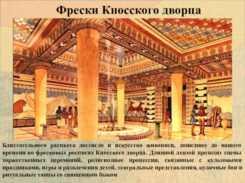 времени во фресковых росписях Кносского дворца. Длинной лентой проходят сцены торжественных церемоний, религиозные процессии, связанные с культовыми праздниками, игры и развлечения детей, театральные представления, кулачные бои и ритуальные танцы со священным быком