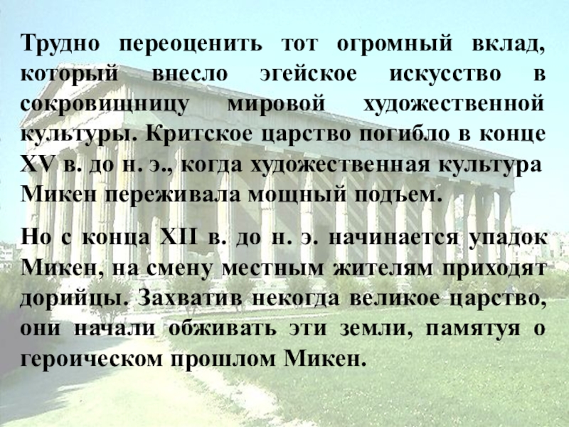 Слайд 27Трудно переоценить тот огромный вклад, который внесло эгейское искусство в сокровищницу